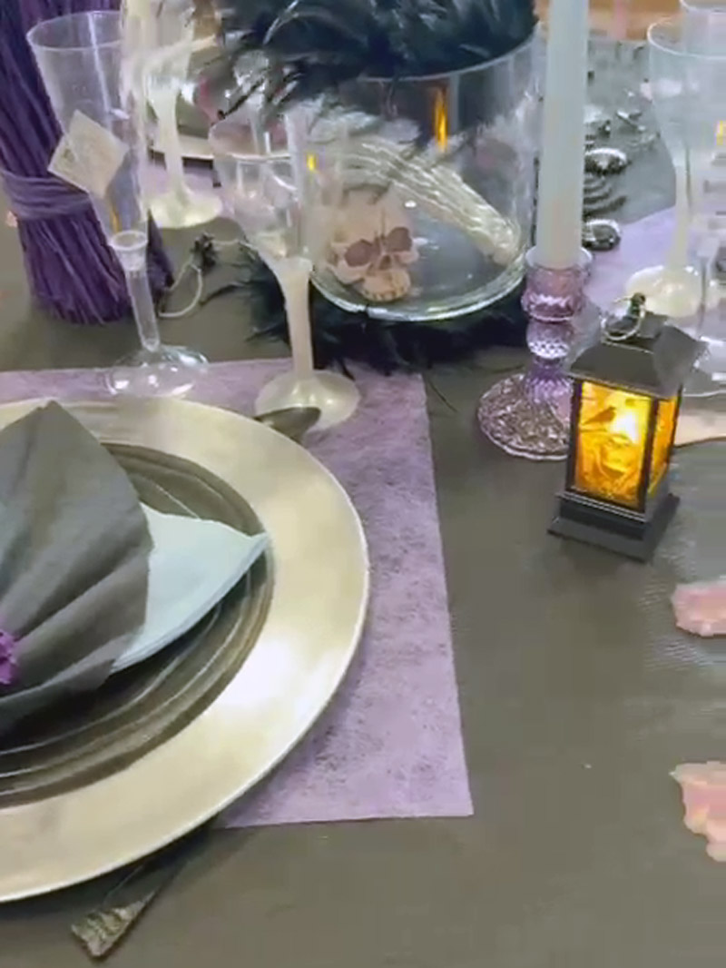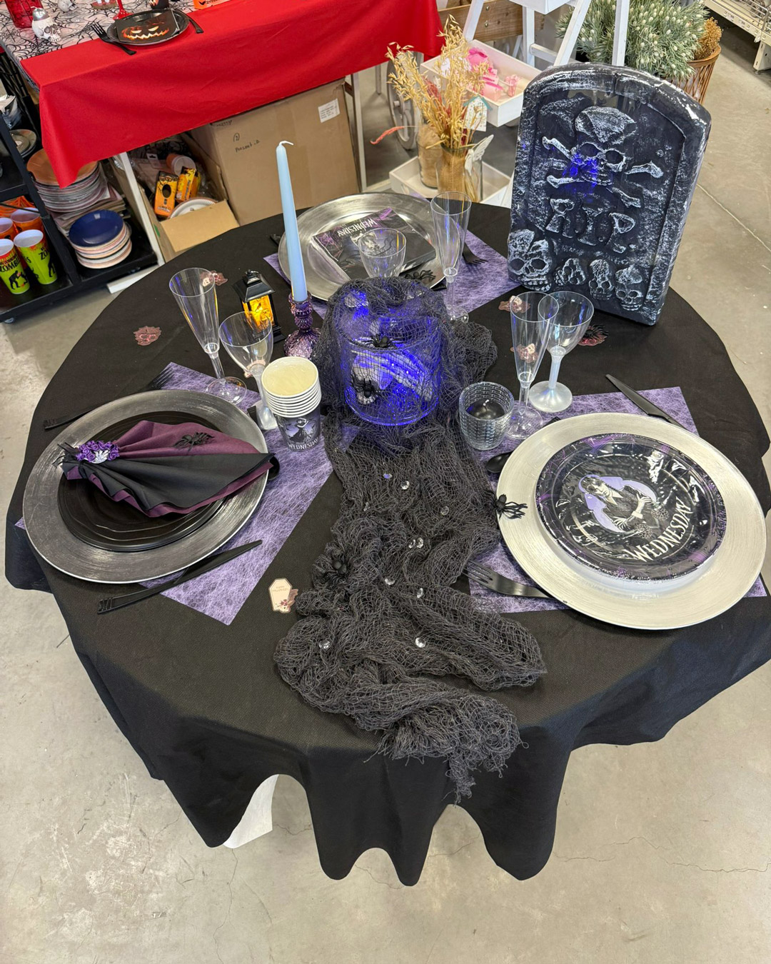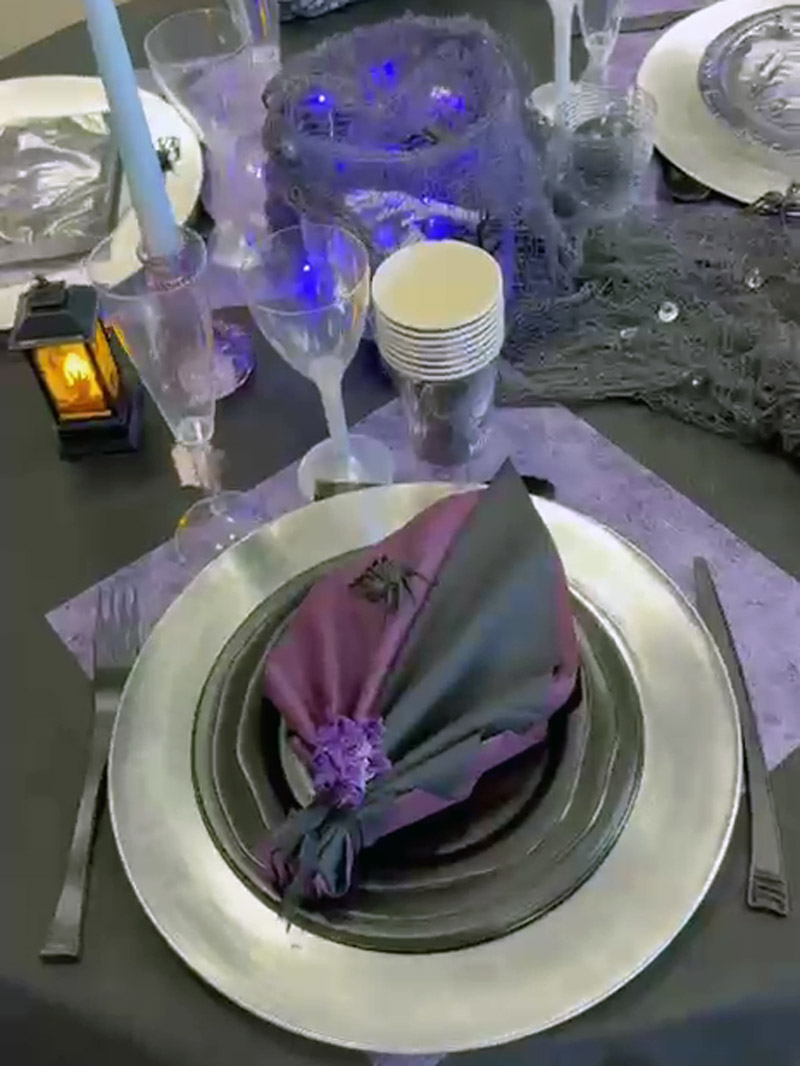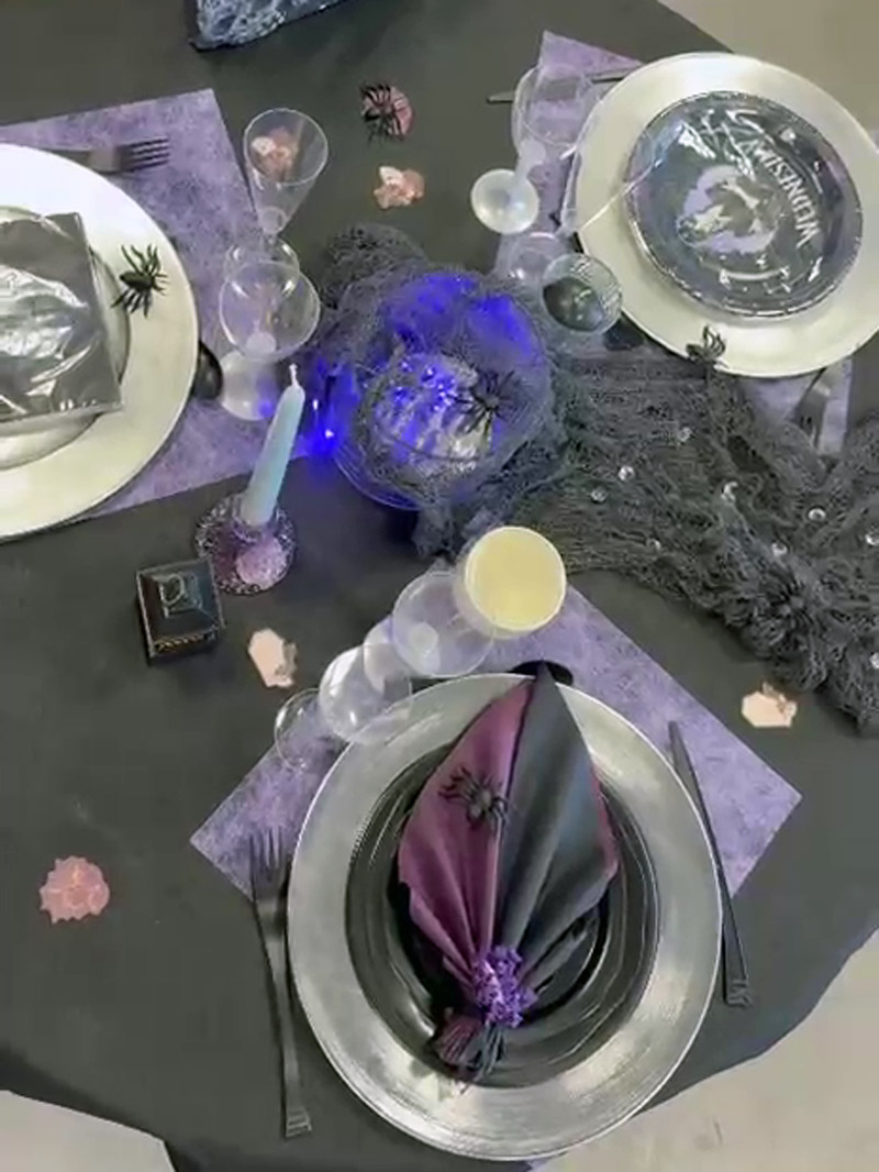 Nous vous proposons aujourd’hui cette table noire aux accents argent et mauve qui vous aidera à rendre cette soirée inoubliable :