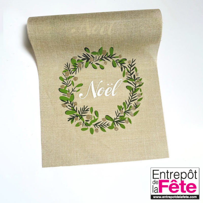 Descriptif : chemin de table taupe de noël avec motif « noël » et feuillages verts. Touche fine de paillettes or sur le feuillage. 100 % polyester et lavable à la main.
